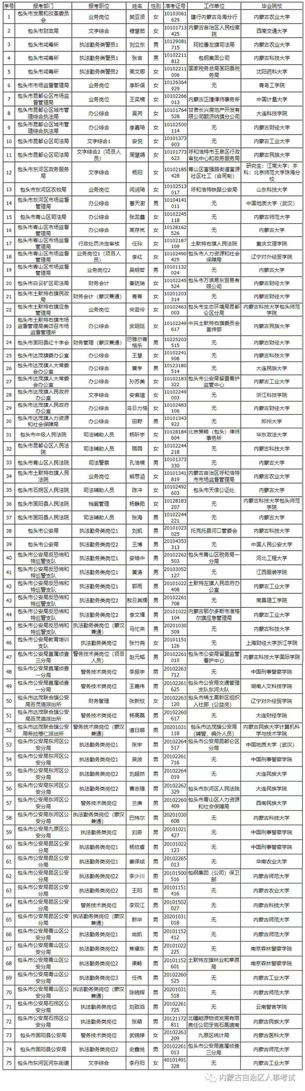 根据《内蒙古自治区党政群机关2021年考试录用公务员简章》及有关规定、考生考试总成绩以及体检、考察结果,现对内蒙古自治区包头市部分拟录用人员予以公示。