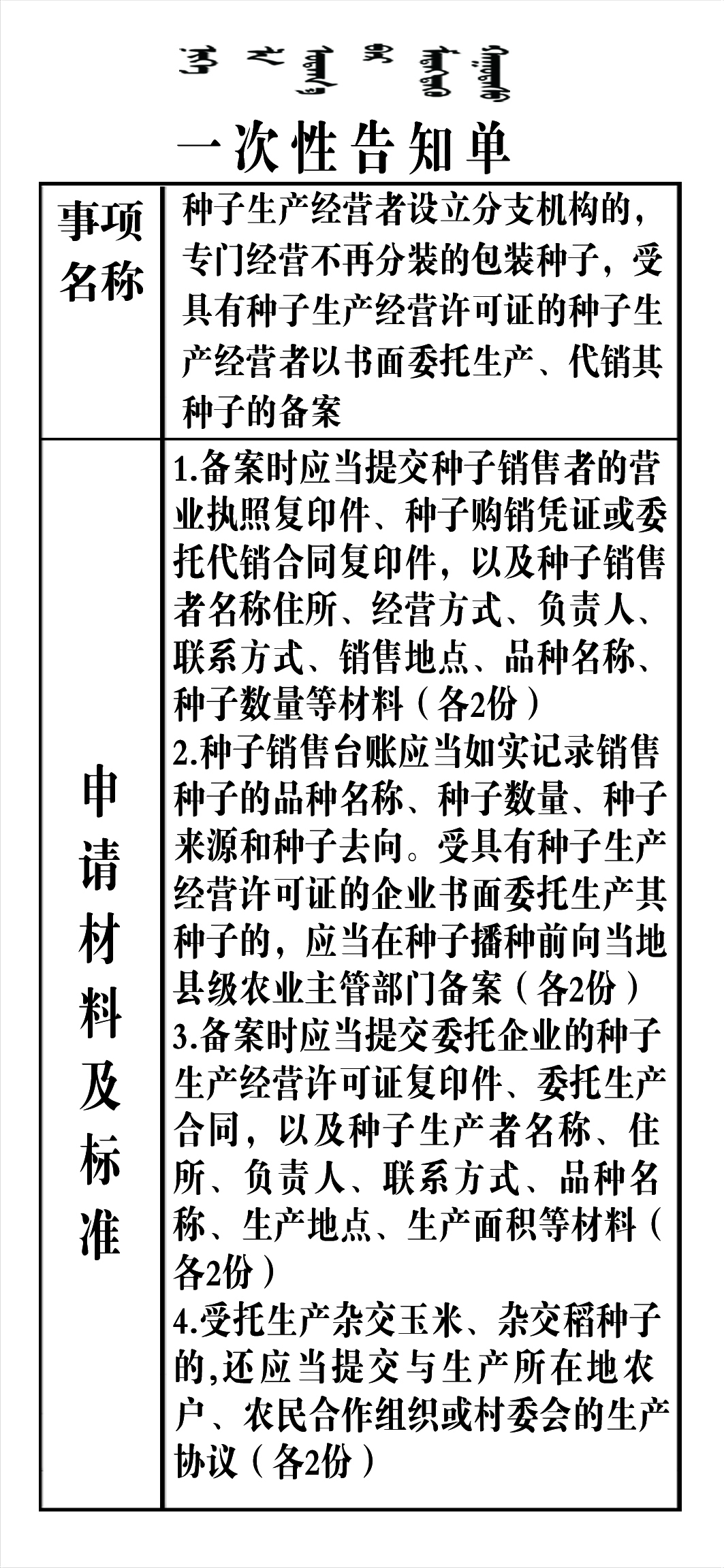 种子生产经营者设立分支机构的,专门经营不再分装的包装种子,受具有种子生产经营许可证的种子生产经营者以书面委托生产、代销其种子的备案