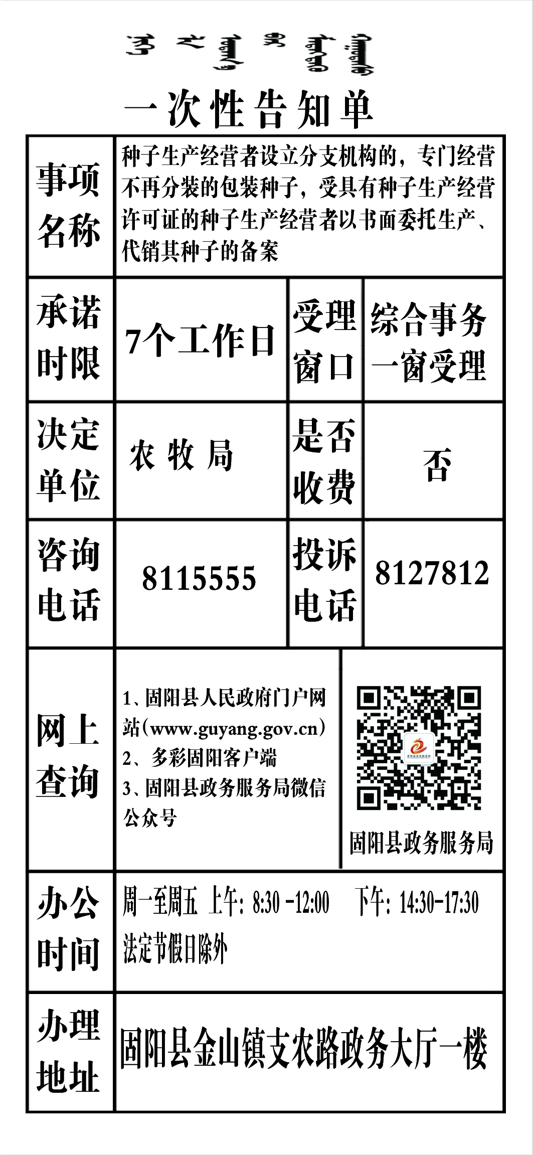 政务服务事项告知单